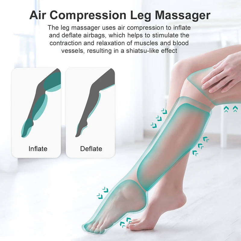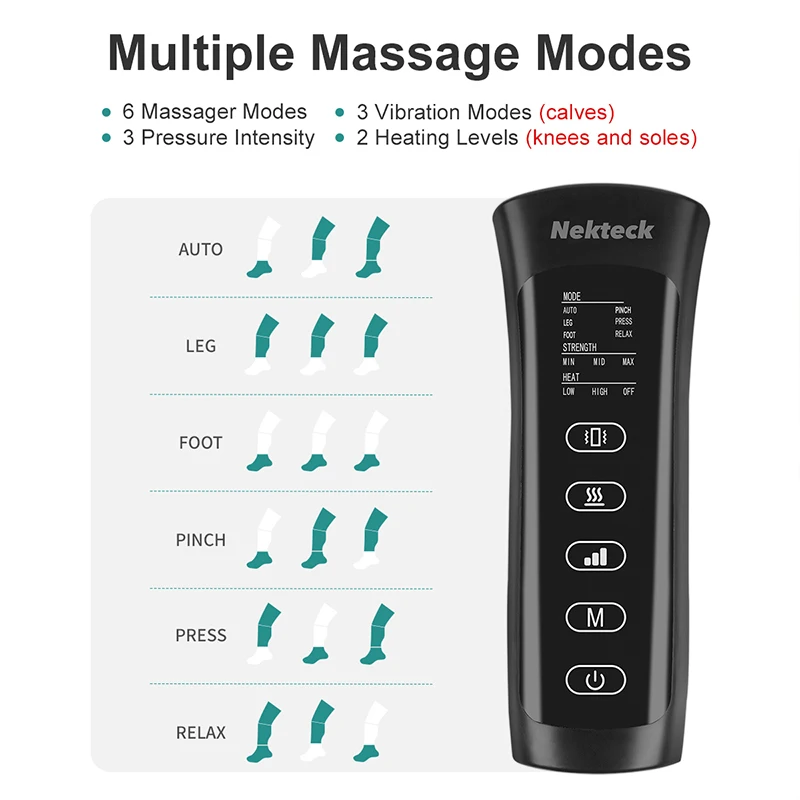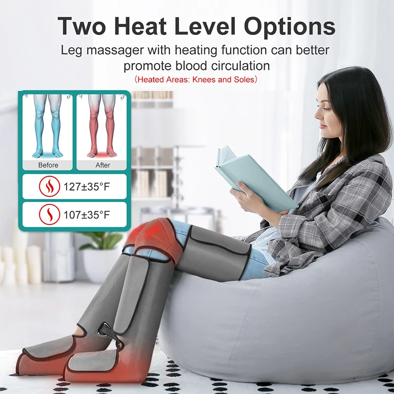 Relax and revitalize your legs with this Foot & Leg Air Compression Massager, featuring adjustable air pressure therapy and soothing heat for both knees and feet. Ideal for relieving fatigue, swelling, poor circulation, and muscle tension.